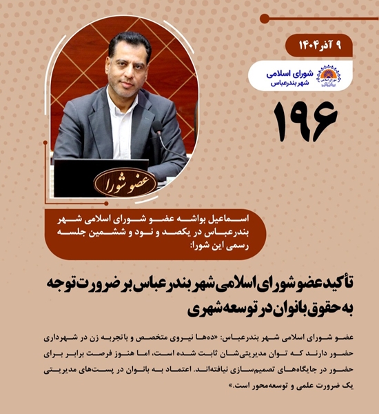 جلسه رسمی شماره ۱۹۶ شورای اسلامی شهر بندرعباس با نطق پیش از دستور اسماعیل بواشه، عضو شورا، آغاز شد. وی در سخنان خود با اشاره به نقش کلیدی بانوان در توسعه و آرامش اجتماعی، بر ضرورت توجه جدی به سهم آنان از امکانات شهری تأکید کرد.