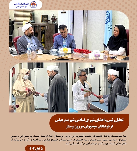 به مناسبت ولادت حضرت زینب کبری (س) و روز پرستار، عبدالرضا حیدری سراحی رئیس شورای اسلامی شهر بندرعباس، با حضور در بیمارستان خلیج فارس، با اهدای گل و تبریک، از تلاشهای شبانهروزی کادر درمان این مرکز قدردانی کرد.