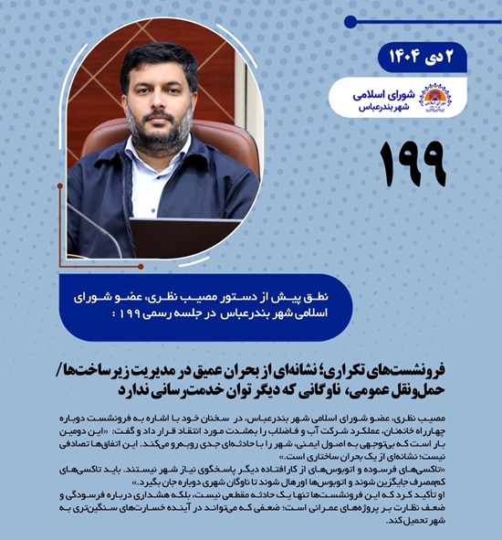در پی بارندگی‌های اخیر و آشکار شدن ضعف‌های زیرساختی بندرعباس، مصیب نظری عضو شورای اسلامی شهر با انتقاد شدید از عملکرد دستگاه‌های خدمات‌رسان هشدار داد که مجموعه‌ای از حفاری‌های بی‌ضابطه، دستکاری‌های غیرکارشناسی در مسیر آب و بی‌توجهی به اصول ایمنی، شهر را در برابر بحران‌ها بی‌دفاع کرده و زیرساخت‌های حیاتی را در معرض تهدید جدی قرار داده است.