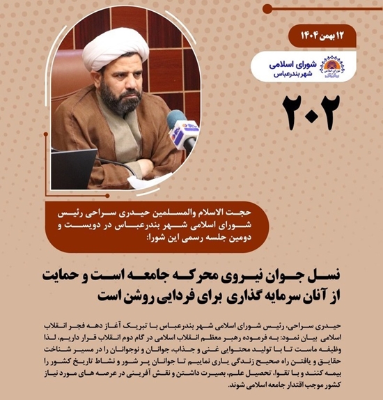 به گزارش روابط عمومی شورا، حجت الاسلام والمسلمین حیدری سراحی رئیس شورای اسلامی شهر بندرعباس در جلسه رسمی شماره 202 شورا، ضمن تبریک فرا رسیدن نیمه شعبان و ایام خجسته این ماه مبارک و میلادحضرت علی اکبر(ع) و روز جوان و خیر مقدم به میهمانان جلسه و مدیر عامل محترم جمعیت هلال احمر هرمزگان، اقدام اتحادیه اروپا مبنی بر تروریستی بودن سپاه پاسداران را محکوم نمود و برای تمام سربازان و پاسداران انقلاب اسلامی آرزوی سلامتی کرد.