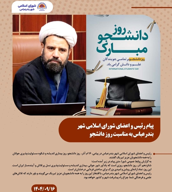 رئیس و اعضای شورای اسلامی شهر بندرعباس، با افتخار این روز را به همه دانشجویان عزیز تبریک می‌گویند و باور دارند که تلاش‌های علمی و فرهنگی شما، چراغ راه پیشرفت شهر و کشور خواهد بود.