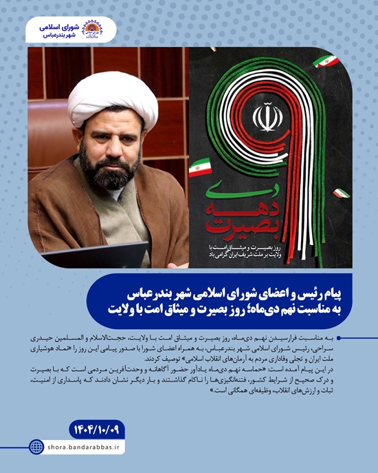 رئیس و اعضای شورای اسلامی شهر بندرعباس با تأکید بر اینکه بصیرت، سرمایه ماندگار ملت ایران است، افزودند: «امروز نیز همان روحیه هوشیاری و مسئولیت‌پذیری اجتماعی باید در مدیریت شهری، مشارکت مردمی و تقویت انسجام اجتماعی جلوه‌گر شود تا مسیر پیشرفت و آرامش شهر بندرعباس با قدرت ادامه یابد.»