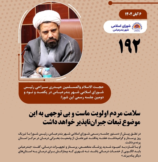 با توجه به افزایش سفرهای درمانی شهروندان به خارج از استان، ️بار مالی سنگین بر خانواده‌ها و کاهش کیفیت خدمات درمانی، رئیس شورا نسبت به تبعات انسانی و اجتماعی بی‌توجهی به سلامت عمومی هشدار داد و از وزارت بهداشت و مدیران استانی درخواست اقدام فوری نمود و آمادگی شورای شهر برای همکاری در ارتقای زیرساخت‌های درمانی را اعلام نمود.