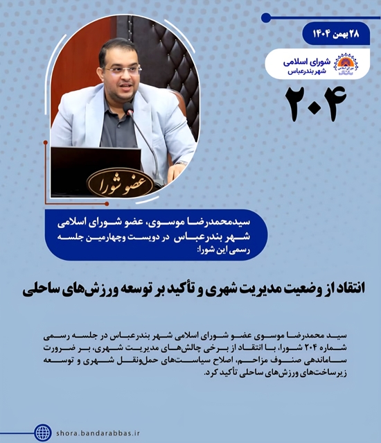 سید محمدرضا موسوی عضو شورای اسلامی شهر بندرعباس در جلسه رسمی شماره ۲۰۴ شورا، با انتقاد از برخی چالش‌های مدیریت شهری، بر ضرورت ساماندهی صنوف مزاحم، اصلاح سیاست‌های حمل‌ونقل شهری و توسعه زیرساخت‌های ورزش‌های ساحلی تأکید کرد.