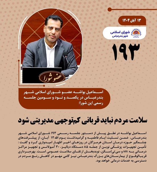 اسماعیل بواشه در نطق پیش از دستور جلسه رسمی ۱۹۳ شورای اسلامی شهر بندرعباس، ضمن تسلیت ایام فاطمیه و گرامیداشت یوم الله۱۳ آبان، از پیشرفتهای چشمگیر حوزه درمان استان هرمزگان در روزهای اخیر اظهار امیدواری کرد و گفت : تأمین تجهیزات پزشکی نوین از جمله ۸۵ دستگاه دیالیز، ۳۰ آمبولانس و تجهیز مراکز درمانی به MRI و سیتیاسکن، نویدبخش ارتقای سلامت عمومی است. بهرهبرداری قریبالوقوع از بیمارستانهای بزرگ بندرعباس نیز گامی مهم در کاهش رنج مردم در دسترسی به خدمات درمانی خواهد بود.