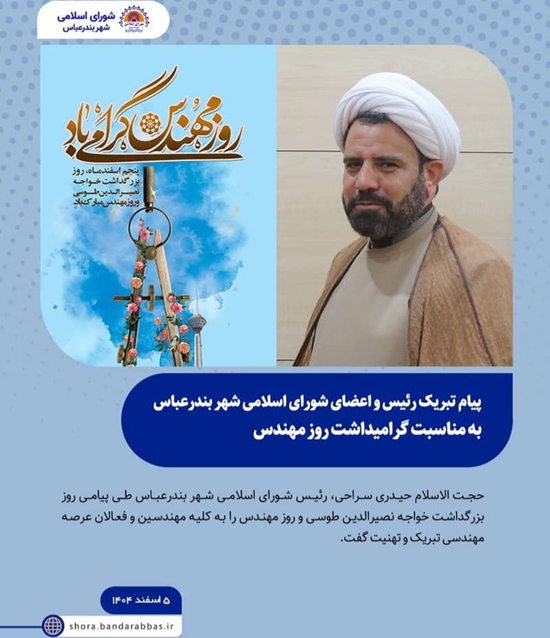حجت الاسلام حیدری سراحی، رئیس شورای اسلامی شهر بندرعباس در پیامی روز بزرگداشت خواجه نصیرالدین طوسی و روز مهندس را به کلیه مهندسین و فعالان عرصه مهندسی تبریک و تهنیت گفت.