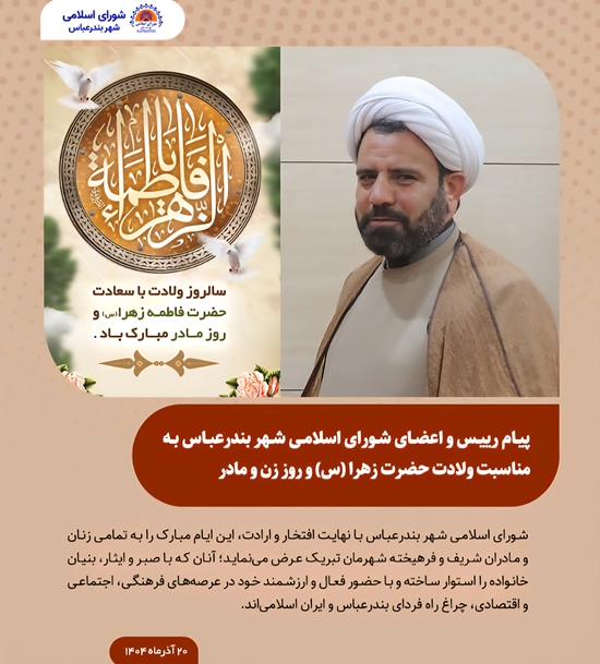 شورای اسلامی شهر بندرعباس با نهایت افتخار و ارادت، این ایام مبارک را به تمامی زنان و مادران شریف و فرهیخته شهرمان تبریک عرض می‌نماید؛ آنان که با صبر و ایثار، بنیان خانواده را استوار ساخته و با حضور فعال و ارزشمند خود در عرصه‌های فرهنگی، اجتماعی و اقتصادی، چراغ راه فردای بندرعباس و ایران اسلامی‌اند.